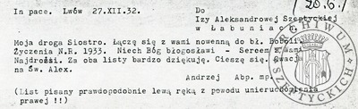 List Metropolity Andrzeja Szeptyckiego do Izabelli Aleksandrowej Szeptyckiej