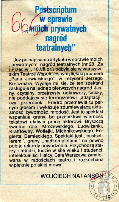 Postscriptum w sprawie “moich prywatnych nagród teatralnych”