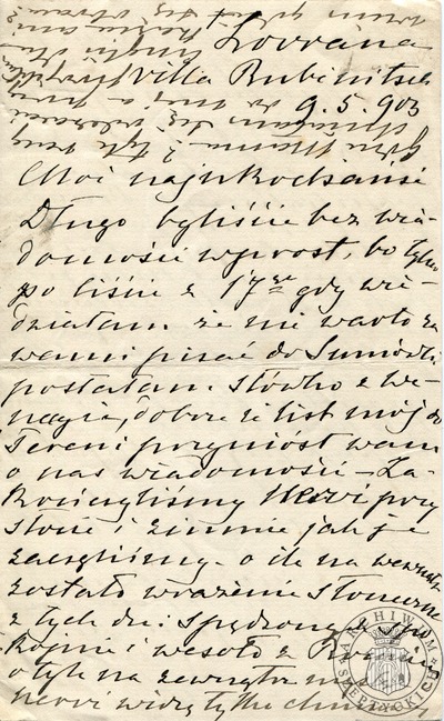 09-05-1903 List Zofii z Fredrów Szeptyckiej do Aleksandra Szeptyckiego i Izabelli z Sobańskich Aleksandrowej Szeptyckiej