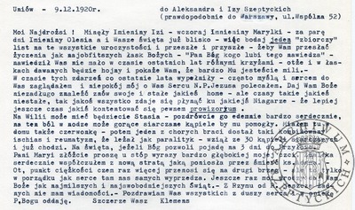 09-12-1920 List Kazimierza Szeptyckiego (późniejszego Ojca Klemensa Szeptyckiego) do Aleksandra Szeptyckiego i Izabelli z Sobańskich Aleksandrowej Szeptyckiej
