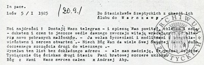 05-01-1925 List Metropolity Andrzeja Szeptyckiego do Marii z Sapiehów Stanisławowej Szeptyckiej i Stanisława Szeptyckiego