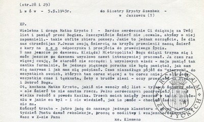 05-03-1943 List Kazimierza Szeptyckiego (późniejszego Ojca Klemensa Szeptyckiego) do Siostry Krysty Szembek