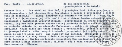 12-10-1921 List Kazimierza Szeptyckiego (późniejszego Ojca Klemensa Szeptyckiego) do Izabelli z Sobańskich Aleksandrowej Szeptyckiej