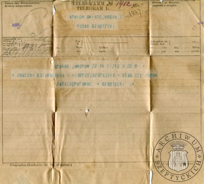 Telegram Romana Szeptyckiego (Metropolita Andrzej Szeptycki) do Stanisława Szeptyckiego