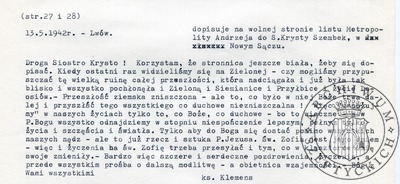 13-05-1942 List Kazimierza Szeptyckiego (późniejszego Ojca Klemensa Szeptyckiego) do Siostry Krysty Szembek