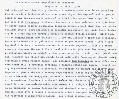 14-01-1902 List Zofii z Fredrów Szeptyckiej do Aleksandra Szeptyckiego i Izabelli z Sobańskich Aleksandrowej Szeptyckiej