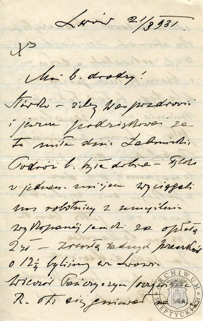 16-10-1943 List Kazimierza Szeptyckiego (późniejszego Ojca Klemensa Szeptyckiego) do Anny Szeptyckiej